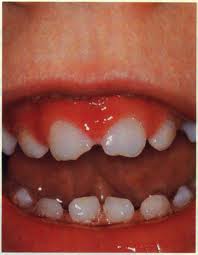 Triệu chứng: Lợi đỏ rực cả hai hàm. Trẻ có thể sốt, bỏ ăn, dễ chảy máu. Bệnh viêm lợi ở những trẻ này thường diễn biến cấp tính, triệu chứng rầm rộ.